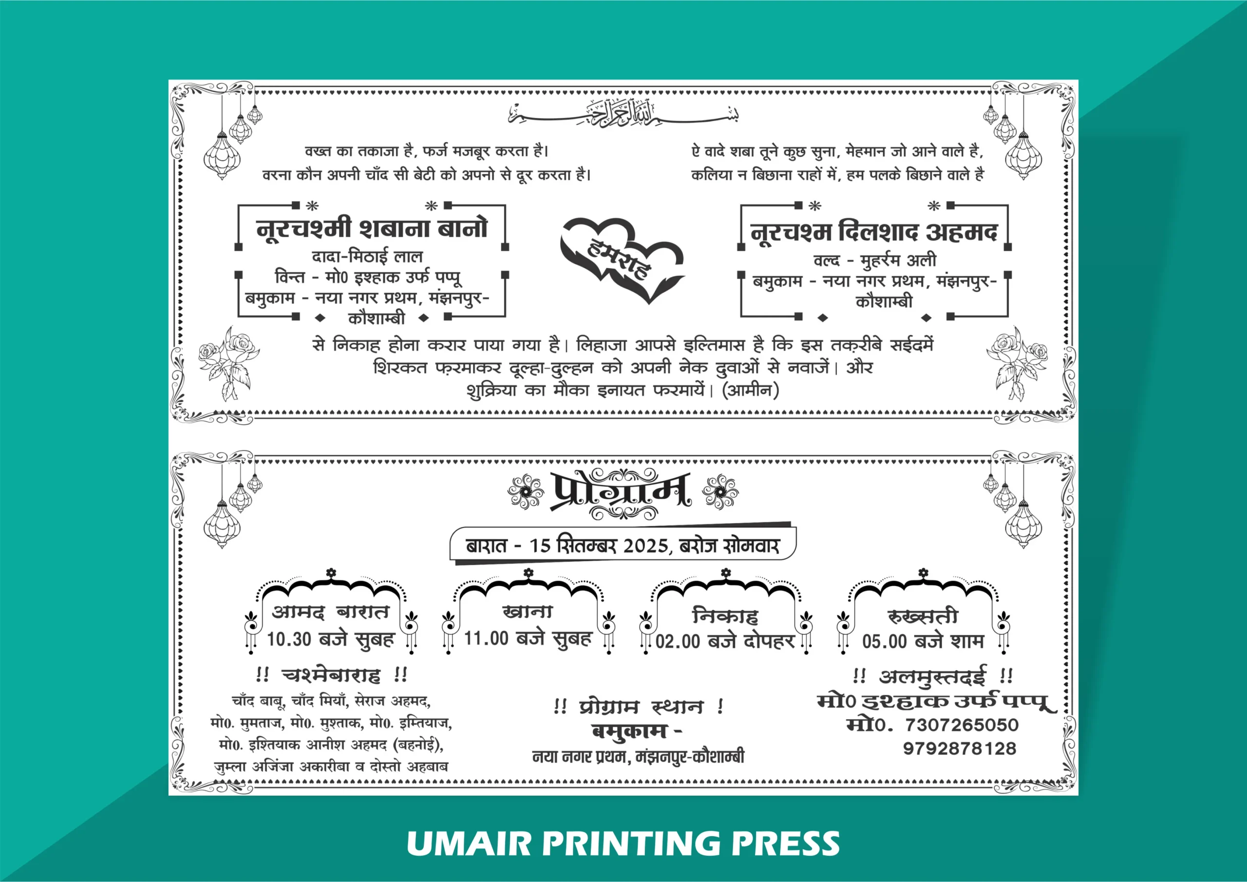 At Umair Printing Press, we combine high-quality printing, elegant fonts, and artistic layouts with rich and graceful wording that resonates with your family traditions. Whether you prefer royal wedding card themes, minimalist designs, or luxurious embossed printing, our Hindi Muslim wedding card matter will make your invitation stand out. We cater to all styles – from classic traditional invitations to modern designer cards – with options for gold foiling, vibrant colors, and premium paper quality.